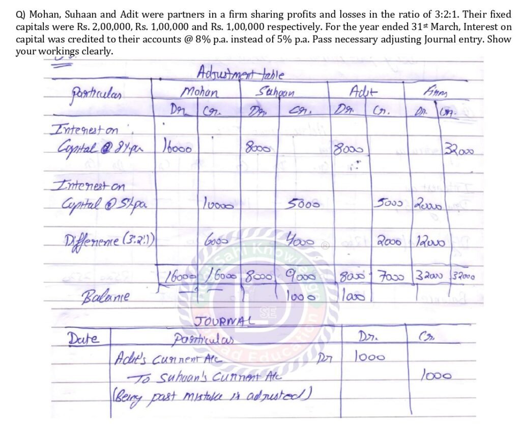 Mohan, Suhaan and Adit were partners in a firm sharing profits and losses in the ratio of 3:2:1. Their fixed capitals were Rs. 2,00,000, Rs. 1,00,000 and Rs. 1,00,000 respectively. For the year ended 31st March, Interest on capital was credited to their accounts @ 8% p.a. instead of 5% p.a. Pass necessary adjusting Journal entry. Show your workings clearly.