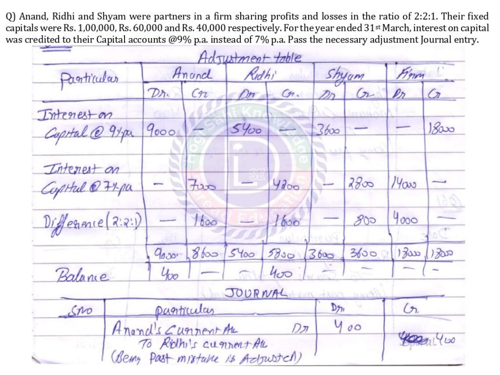 Anand, Ridhi and Shyam were partners in a firm sharing profits and losses in the ratio of 2:2:1. Their fixed capitals were Rs. 1,00,000, Rs. 60,000 and Rs. 40,000 respectively. For the year ended 31st March, interest on capital was credited to their Capital accounts @9% p.a. instead of 7% p.a. Pass the necessary adjustment Journal entry.