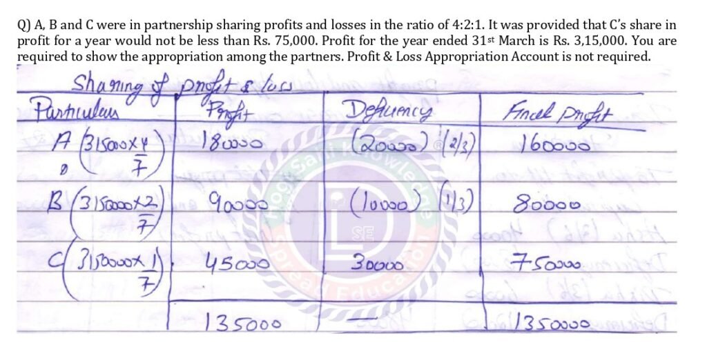 A, B and C were in partnership sharing profits and losses in the ratio of 4:2:1. It was provided that C’s share in profit for a year would not be less than Rs. 75,000. Profit for the year ended 31st March is Rs. 3,15,000. You are required to show the appropriation among the partners. Profit & Loss Appropriation Account is not required.