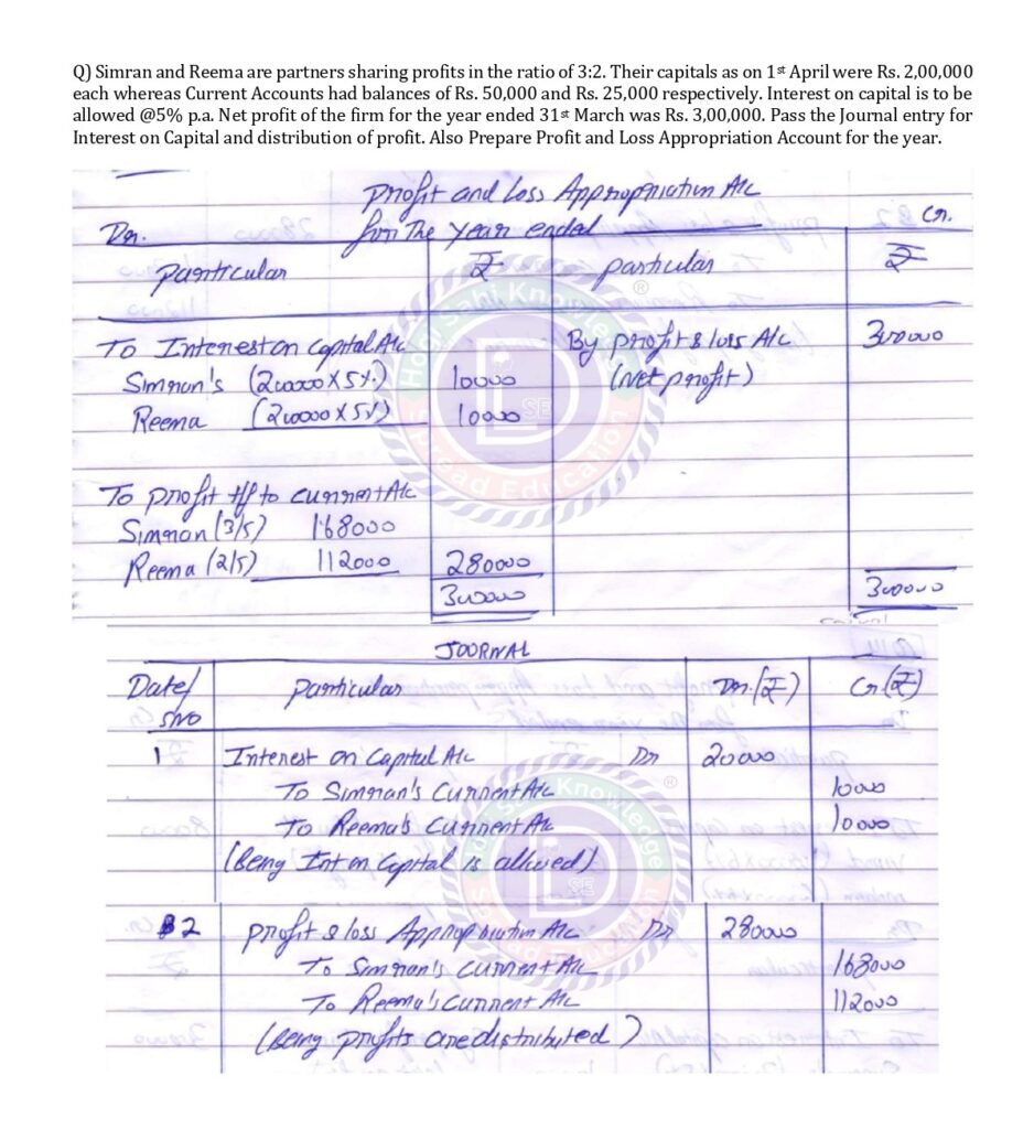Simran and Reema are partners sharing profits in the ratio of 3:2. Their capitals as on 1st April were Rs. 2,00,000 each whereas Current Accounts had balances of Rs. 50,000 and Rs. 25,000 respectively. Interest on capital is to be allowed @5% p.a. Net profit of the firm for the year ended 31st March was Rs. 3,00,000. Pass the Journal entry for Interest on Capital and distribution of profit. Also Prepare Profit and Loss Appropriation Account for the year.