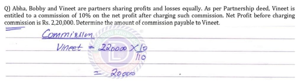 Abha, Bobby and Vineet are partners sharing profits and losses equally. As per Partnership deed, Vineet is entitled to a commission of 10% on the net profit after charging such commission. Net Profit before charging commission is Rs. 2,20,000. Determine the amount of commission payable to Vineet.