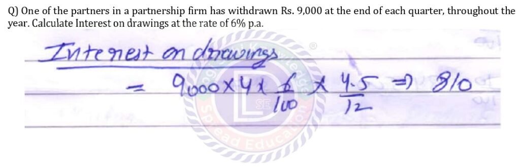 One of the partners in a partnership firm has withdrawn Rs. 9,000 at the end of each quarter, throughout the year. Calculate Interest on drawings at the rate of 6% p.a.