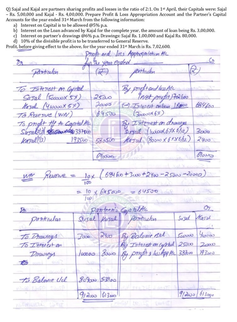 c) Interest on partner’s drawings @6% p.a. Drawings: Sajal Rs. 1,00,000 and Kajal Rs. 80,000.