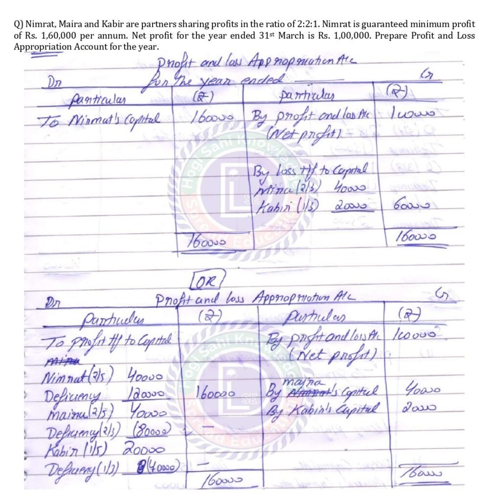 Nimrat, Maira and Kabir are partners sharing profits in the ratio of 2:2:1. Nimrat is guaranteed minimum profit of Rs. 1,60,000 per annum. Net profit for the year ended 31st March is Rs. 1,00,000. Prepare Profit and Loss Appropriation Account for the year.