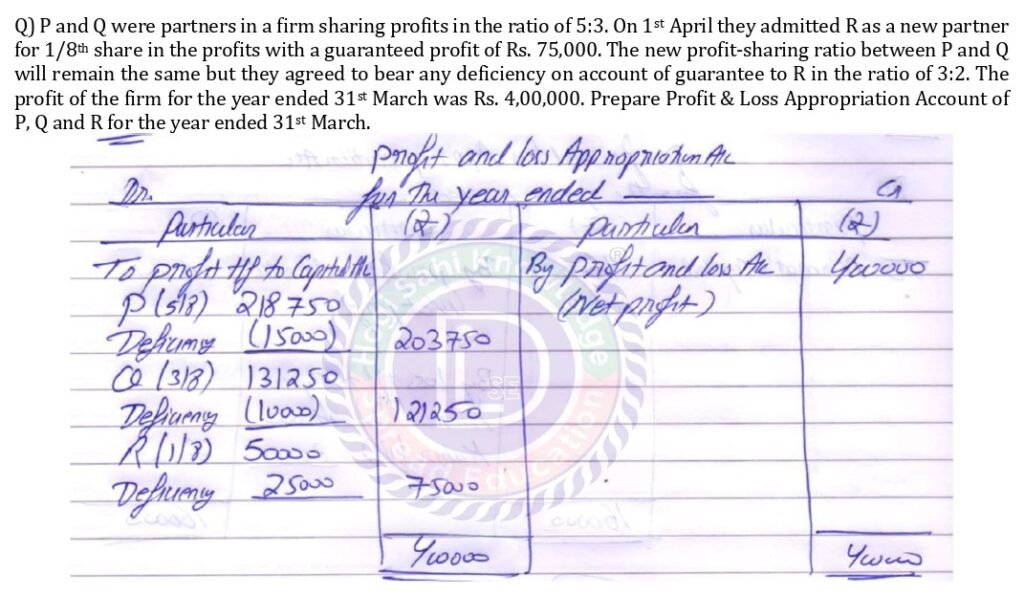 P and Q were partners in a firm sharing profits in the ratio of 5:3. On 1st April they admitted R as a new partner for 1/8th share in the profits with a guaranteed profit of Rs. 75,000. The new profit-sharing ratio between P and Q will remain the same but they agreed to bear any deficiency on account of guarantee to R in the ratio of 3:2. The profit of the firm for the year ended 31st March was Rs. 4,00,000. Prepare Profit & Loss Appropriation Account of P, Q and R for the year ended 31st March.